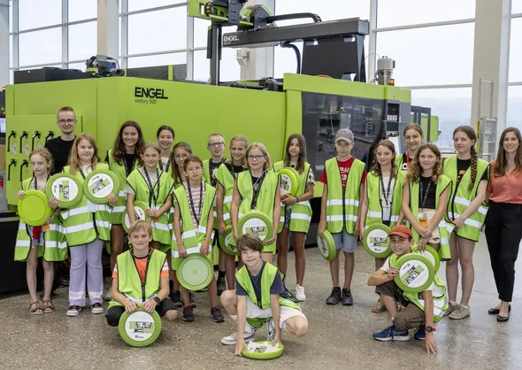 Die zwölf Mädchen und fünf Buben wurden herzlich von den Mitarbeiterinnen und Mitarbeitern empfangen. Nach einer kurzen Einführung hatten sie die Gelegenheit, die innovative Spritzgießtechnik hautnah zu erleben. Oliver Reichhart, der kürzlich seine Lehrabschlussprüfung zum Kunststofftechniker mit gutem Erfolg abschloss, erklärte den Kindern, wie auf ENGEL Spritzgießmaschinen aus kleinen Kunststoffpellets fertige Produkte entstehen. Auf einer ENGEL victory Maschine, ausgerüstet mit einem viper Linearroboter, produzierte das Forscherteam grüne Frisbee-Scheiben. Diese waren 2021 bereits Teil eines Forschungsprojekts an der Johannes Kepler Universität Linz: Im Rahmen der Aktion „Flasche leer, Frisbee her“ wurden dort Stöpsel von PET-Flaschen gesammelt, recycelt und in der LIT Factory zu Frisbees verarbeitet. Dieses Beispiel verdeutlichte den Kindern, wie Kunststoffrecycling dazu beiträgt, Abfall zu vermeiden und die Umwelt zu entlasten.
