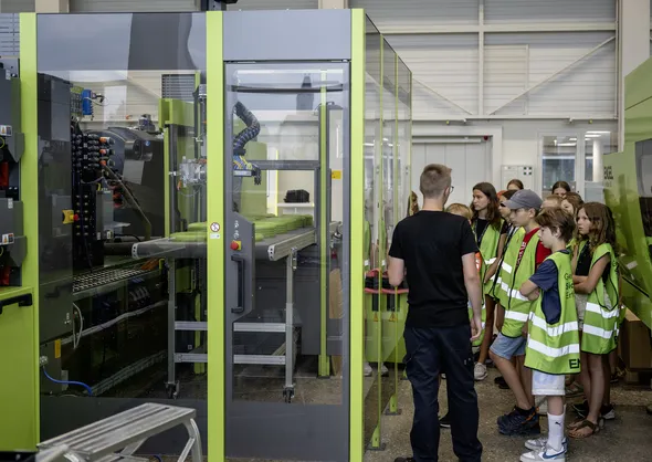 Oliver Reichhart, der kürzlich seine Kunststofftechnik-Lehre bei ENGEL erfolgreich abschloss, erklärte den interessierten Kindern, wie Spritzgießmaschinen funktionieren.