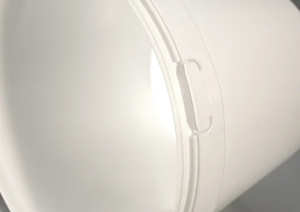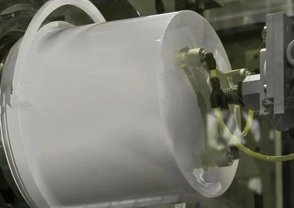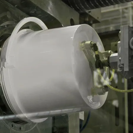 Herstellung eines 5-Gallonen Eimers mit 70 % Rezyklat. Schnell und nachhaltig. Produktion von runden Kunststoffeimern mit recyceltem Material im Kern auf der servo-hydraulischen Mehrkomponenten-Maschine duo speed 500.