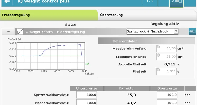 Robust in the face of material fluctuations: even with batch or plastic viscosity fluctuations, the system automatically adjusts – as with classic iQ weight control. This ensures reliable part quality under changing conditions.