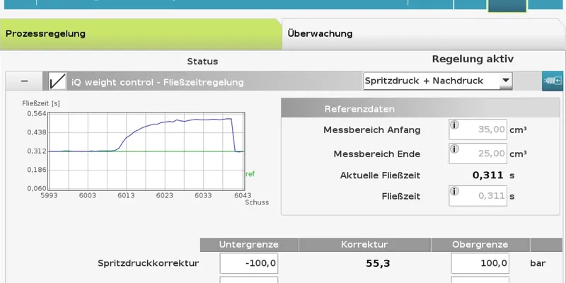 For many years, we have been successfully using iQ weight control for closed loop control of fluctuations in the injection process, such as those caused by changing material batches or temperature fluctuations. The system compares each injection curve with a reference in real time and corrects it automatically.