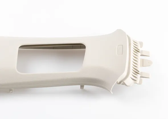 Reduce investment and production costs with foammelt technology (physical foaming of plastics): At K 2025, B-pillar trim components for automotive interior applications will be produced on a WINTEC two-platen injection moulding machine. The foamed core enables material savings without compromising the structural integrity of the part. At the same time, the internal foam pressure ensures good replication of the surface design.