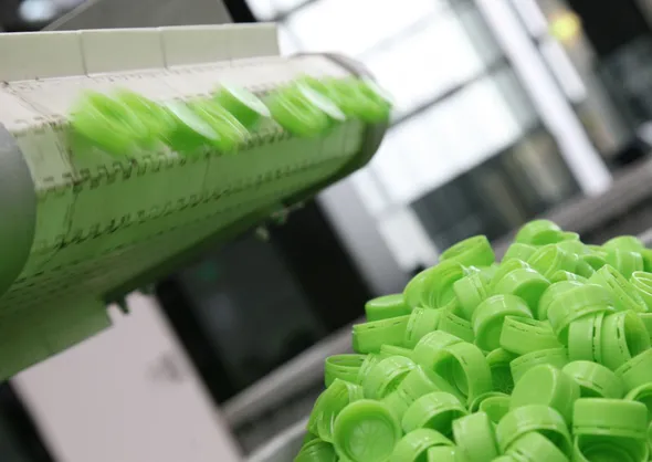 New efficiency standards for the highly integrated production of beverage closures. This e-cap production cell produces 26-mm plastic closures.