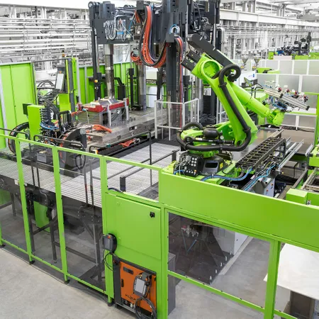 With an increasing complexity of components, it is important to further increase efficiency and cost-effectiveness. Area productivity plays an increasingly important role in this. Thanks to their slim design, easix jointed-arm robots enable particularly compact injection moulding cells. The freedom of orientation remains unrestricted.
