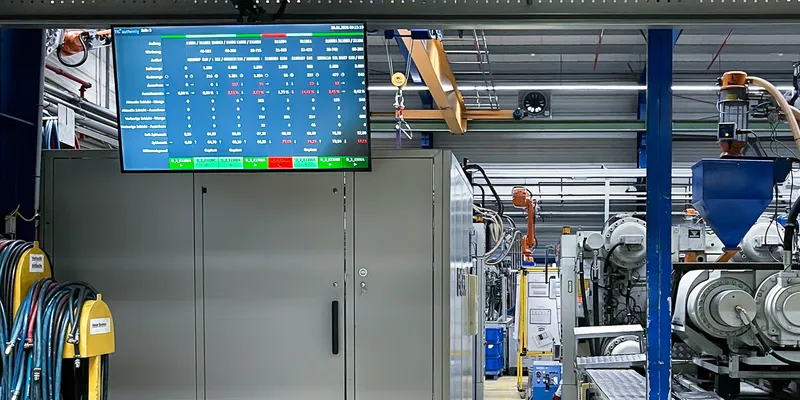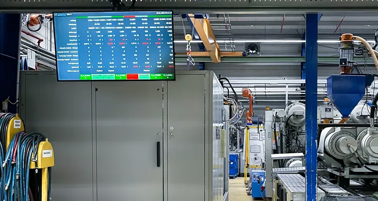 Another key feature is real-time production monitoring: Large screens in the production area display key performance indicators, cycle time deviations, and malfunctions directly at the point of occurrence. Employees can immediately see when processes deviate from the target and take corrective action without delay.