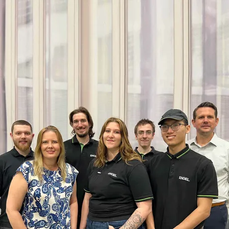 Image shows apprentices from ENGEL in front of an injection molding machine