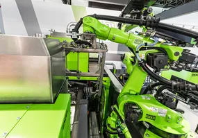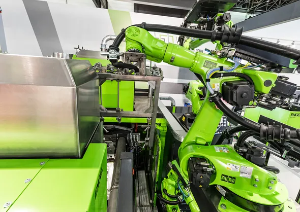 La imagen muestra la solución de automatización de moldeo por inyección de ENGEL
