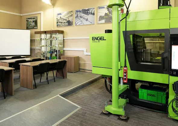 Кроме теоретической базы, занятия включают в себя практические уроки на бесколонной литьевой машине ENGEL victory c линейным роботом ENGEL viper, которыми оборудован учебный центр. ТПА оснащен расширенным пакетом, в который входят энергосберегающий привод ENGEL ecodrive, система смены пресс-форм, пакет удаленного обслуживания ENGEL e-connect.24, клиентский портал ENGEL e-connect, а также «умная» система для компенсации изменяющихся условий производства iQ weight control. Все это дает заказчикам ENGEL возможность ознакомиться с самыми современными техническими решениями в литье под давлением.